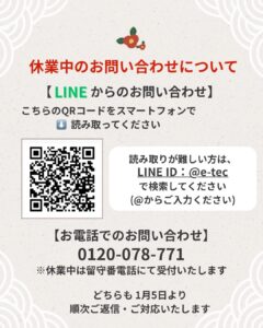 休業中にいただいたお問い合わせは、LINE・お電話ともに 1月5日より順次ご返信 いたします。